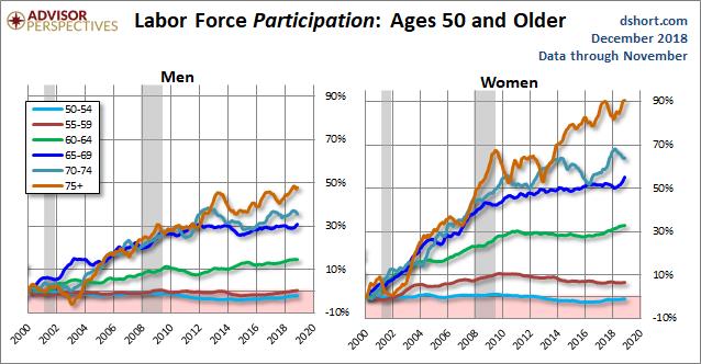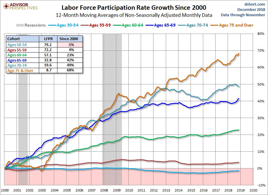 The labor participation rate (the percentage of people aged 16 and above employed or seeking employment) peaked at 67.3% in 2000. The rate has fallen to 62.9% in November 2018. Since the workforce is aging (the oldest Baby Boomers began receiving Social Security between 2008-2012) it seems logical that the participation rate for older workers should have declined the fastest. However, the opposite has occurred.
